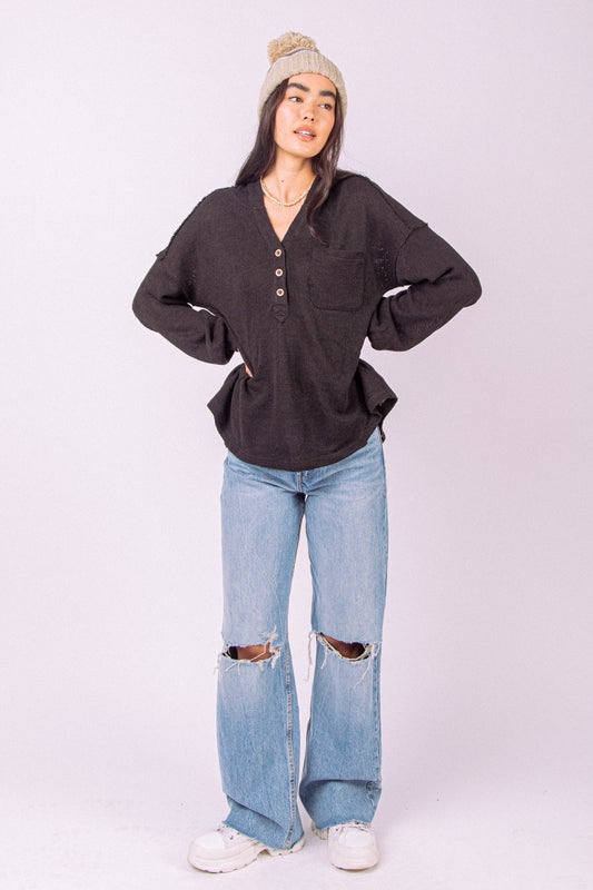 Button Down Hooded Knit Henley Top- Black