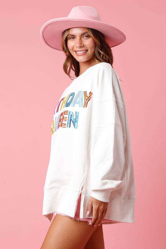 "Birthday Queen" Sequin loose Fit Crewneck- White