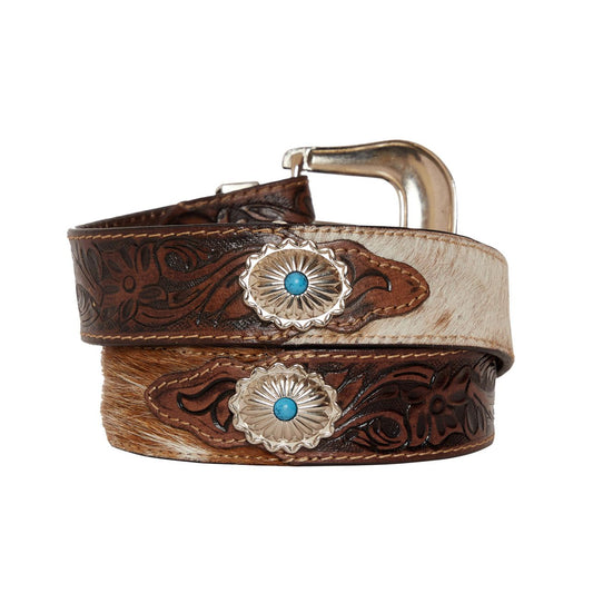 Myra- Mirky Brown Hand Tooled Leather Belt- Brown, White & Teal