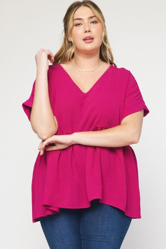 Entro® V-Neck Baby Doll Top with Cuffed Sleeve Detail