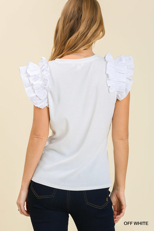 UMGEE® Ribbed Knit Top with Poplin Ruffle Sleeve - Off White