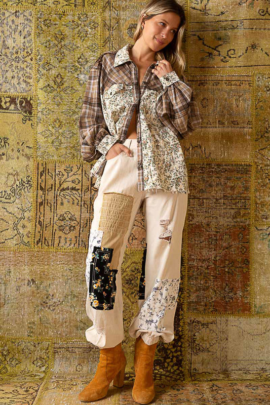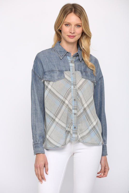 FATE® Tencel Denim Contrast Shirt with Back Gathering- Plaid