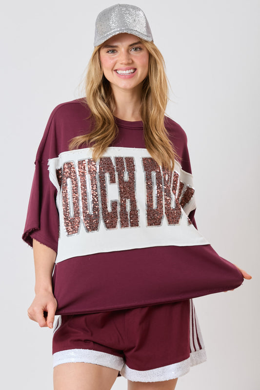 "TOUCHDOWN" Sequin Loose Fit top- Maroon and White