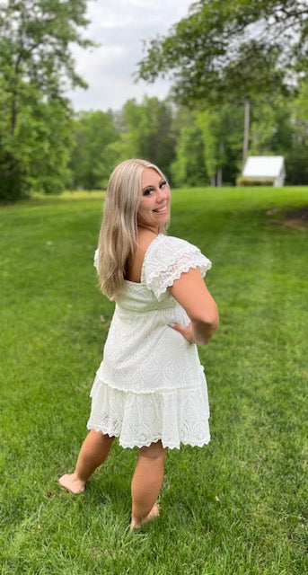 Need a little white dress? Well this is the one. Dainty lace V-neck front with ruffle cap sleeves. Fully lined.