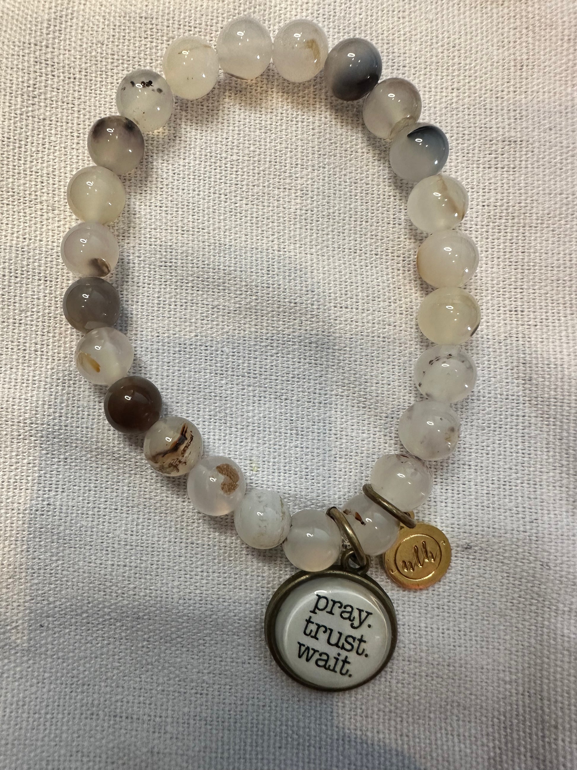 Gold accent charm that says "Pray. Trust Wait." with clear earth tones stone bracelet