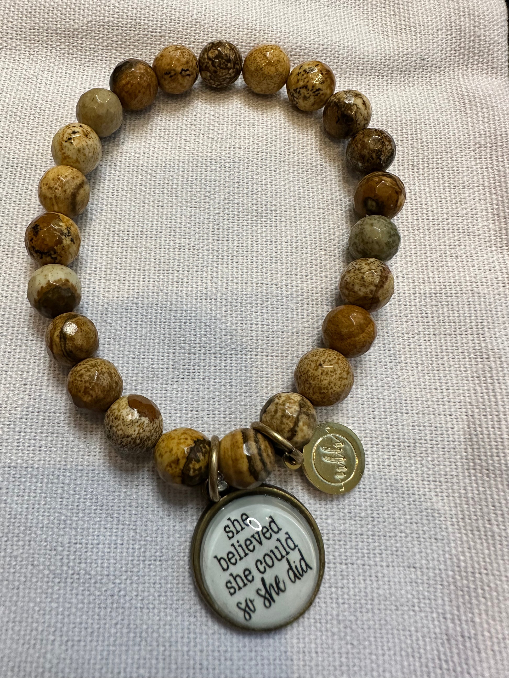 Gold Accent charm that says "She believed she could so she did" with earth tone browns stone bracelet